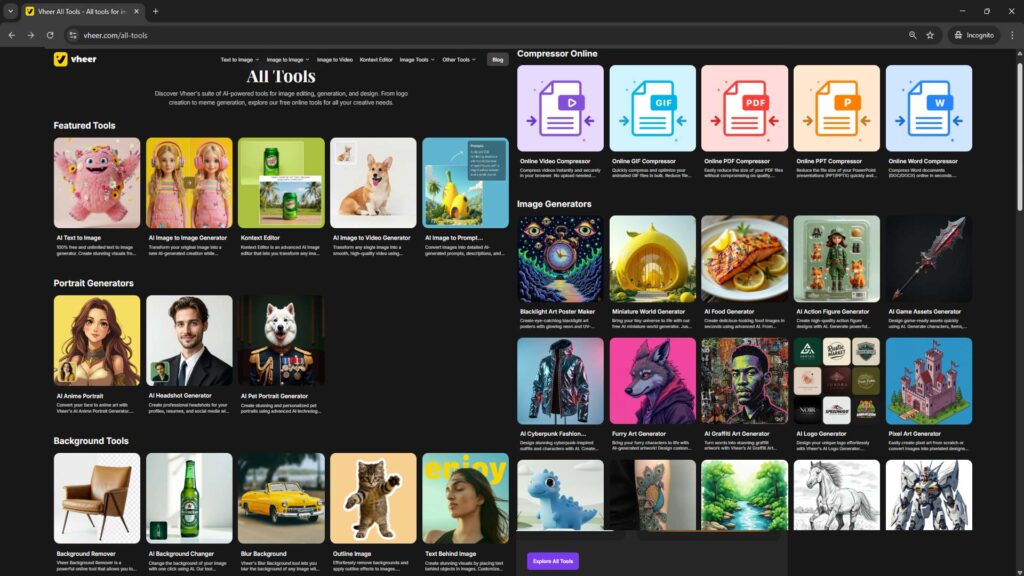 Vheer AI currently offers over 30 creative tools, including text-to-image, image-to-image, background remover, AI anime generator, and image-to-video features.
